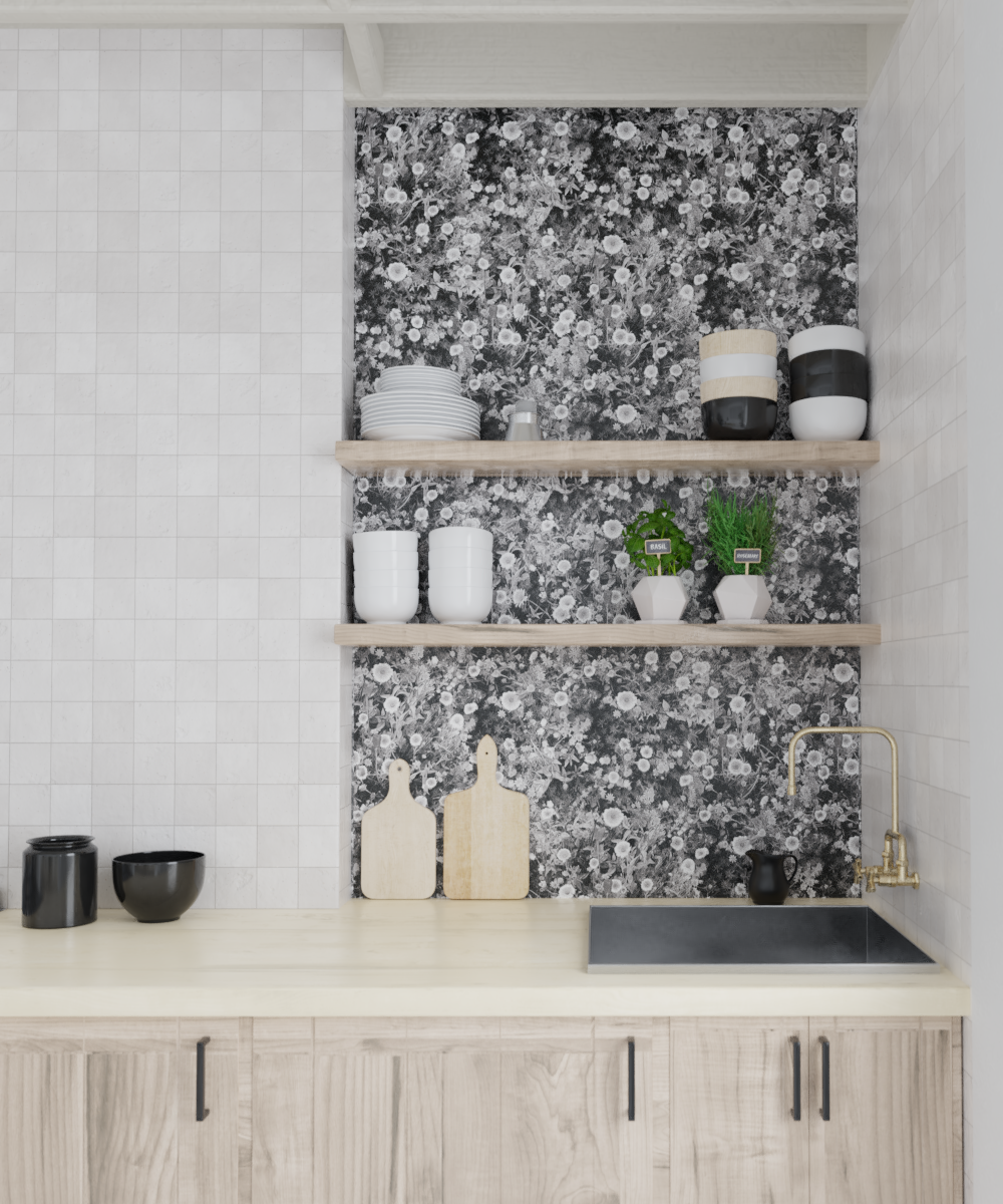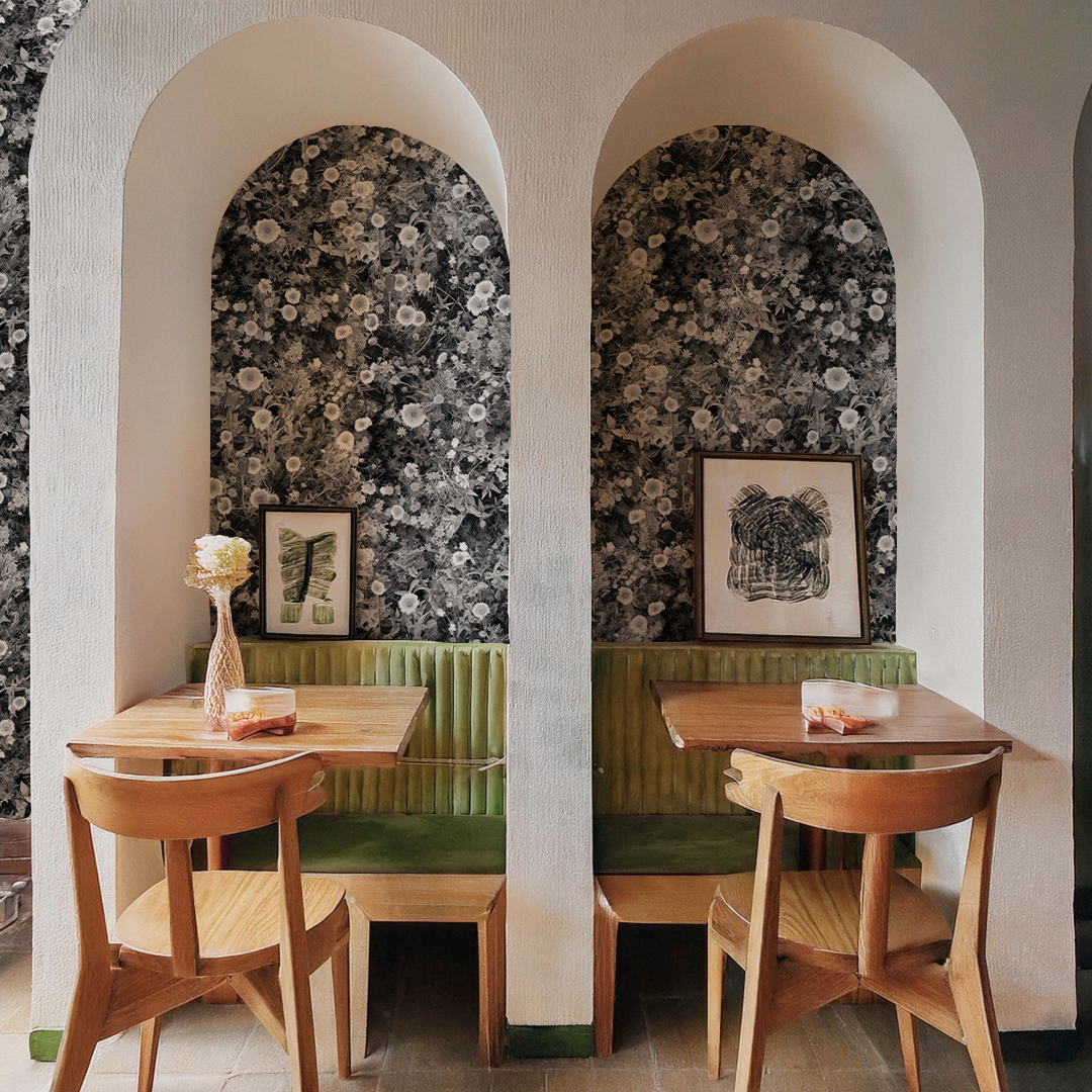 Transform your space with the Cali Flowers Wallpaper, featuring black and white hues and beautiful artwork by Samantha Santana. Inspired by the native springtime blooms in her Pasadena front yard, this wallpaper adds a touch of nature and art to any room. Elevate your décor with this unique and moody wallpaper.
