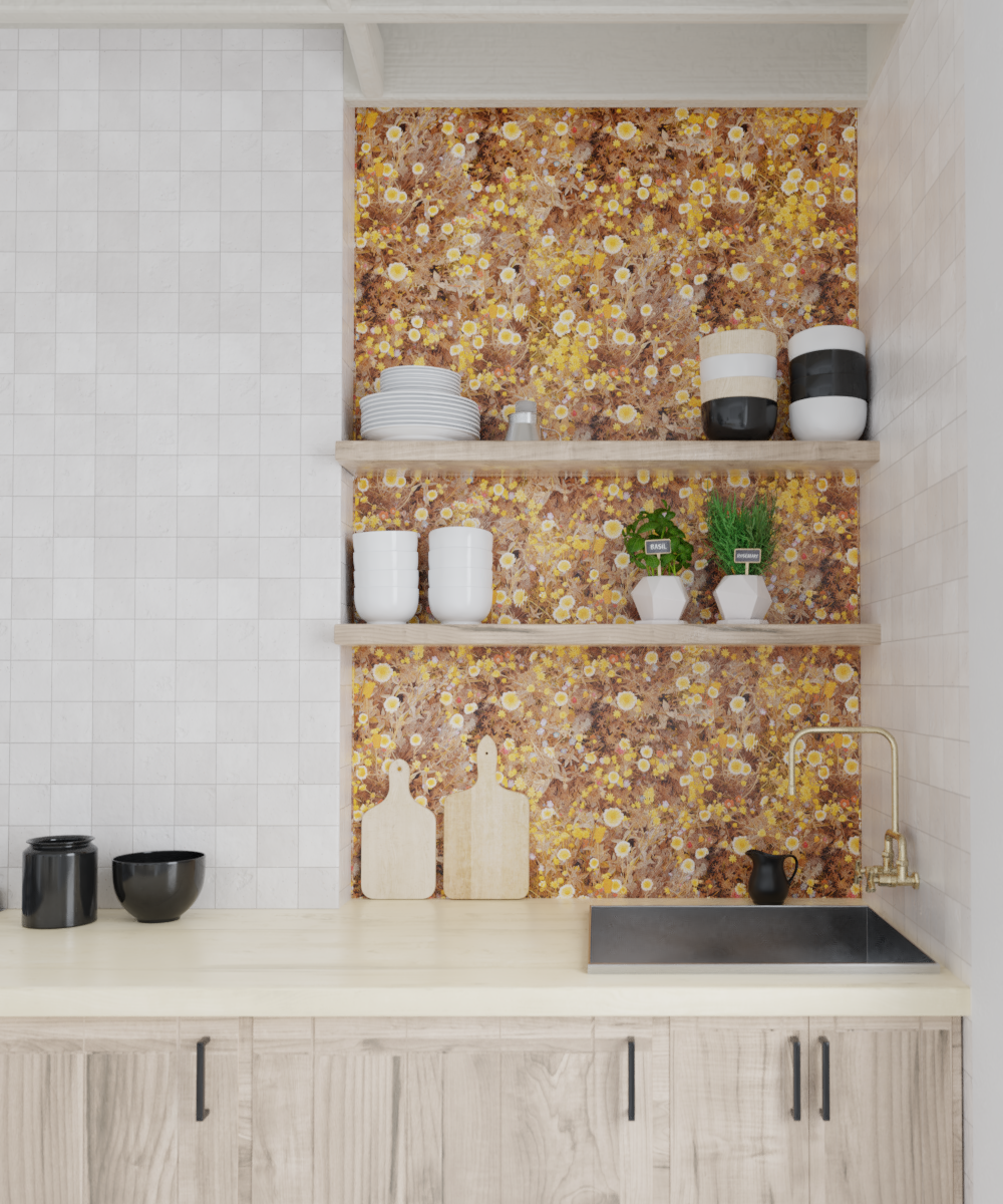 Transform your space with the Cali Flowers Wallpaper, featuring warm yellow and golden hues and beautiful artwork by Samantha Santana. Inspired by the native springtime blooms in her Pasadena front yard, this wallpaper adds a touch of nature and art to any room. Elevate your décor with this unique and vibrant wallpaper.