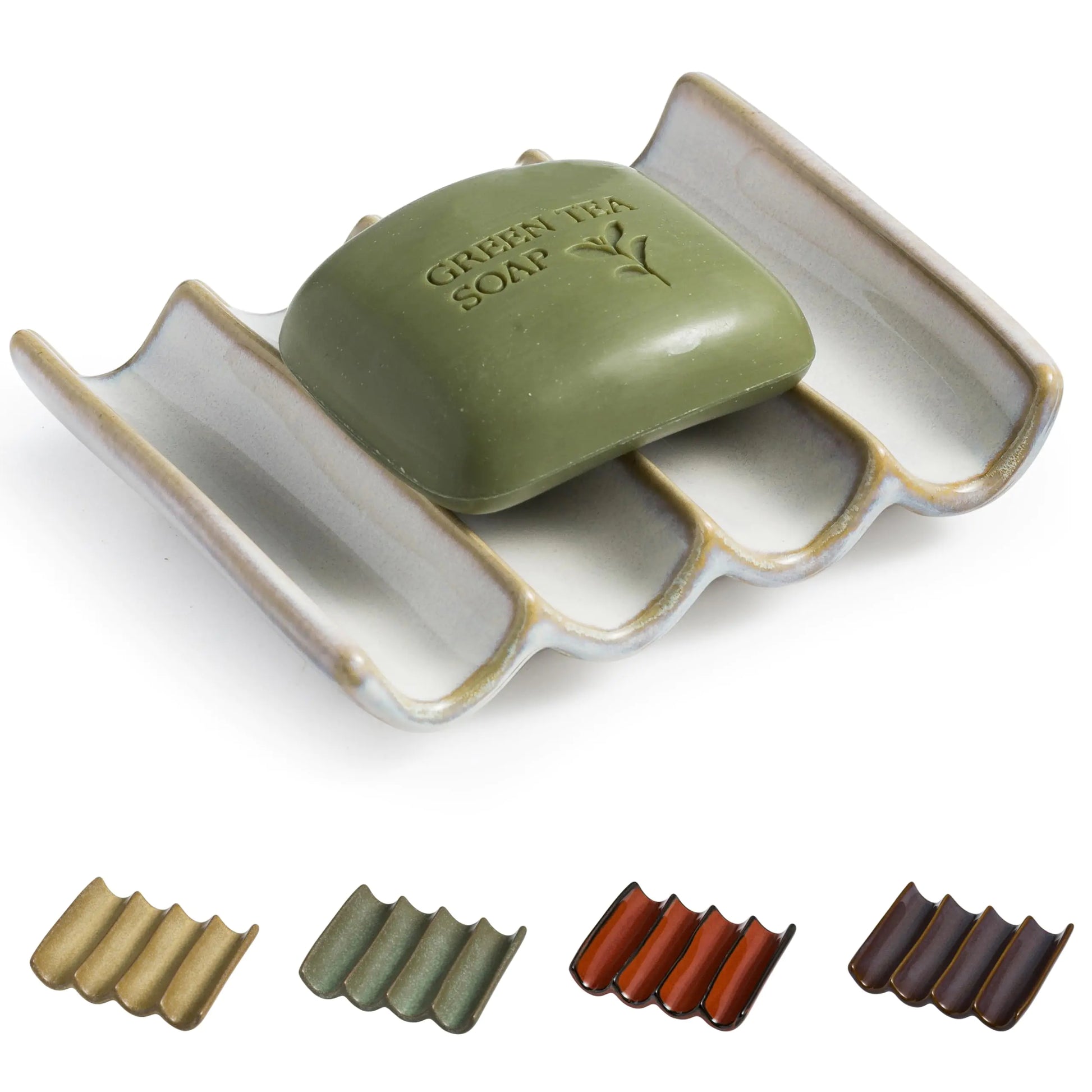 ["[Keeps Your Soap Dry] Are you tired of bar soap sitting in water? This is the solution. Our shower soap holder was designed with wave and raised lines which allow water to drain and keep water from accumulating helping the wet soap bar dry so that the soap doesnt melt away and extending the life of the soap." [Multifunctional Soap Bar Holder] This shower soap dish measures 5" x 3.9" which fits most soap sizes and types. This soap dish is a perfect addition to any bathroom or kitchen sink. This soap tray not only can be used for bar soap but also for kitchen sponges dishwashing brushes etc. It also can be used for placing jewelry keys some crafts and so on. "[Suitable for Multiple Occasions] The soap dishes for bar soap are uniquely designed to be used on multiple occasions. It comes in several colors that complement any decor. Its a versatile accessory you can use it in bathrooms kitchens hotels showers bathtubs and other places." [Easy to Clean] This cute soap dish is made of high-quality ceramic which has a sleek surface and is easy to clean. A simple rinse or wipe is all it takes to keep these ceramic soap dishes in top-notch condition. [Matches Many Decor Prefect] The modern clean design enhances the happiness of home life. Each rectangular soap dish for shower is unique. Adds an attractive touch to any bathroom or kitchen countertop with its distinctive reactive glaze. It can be a thoughtful gift this soap tray is an artistic gift for your friends mom and family.]
