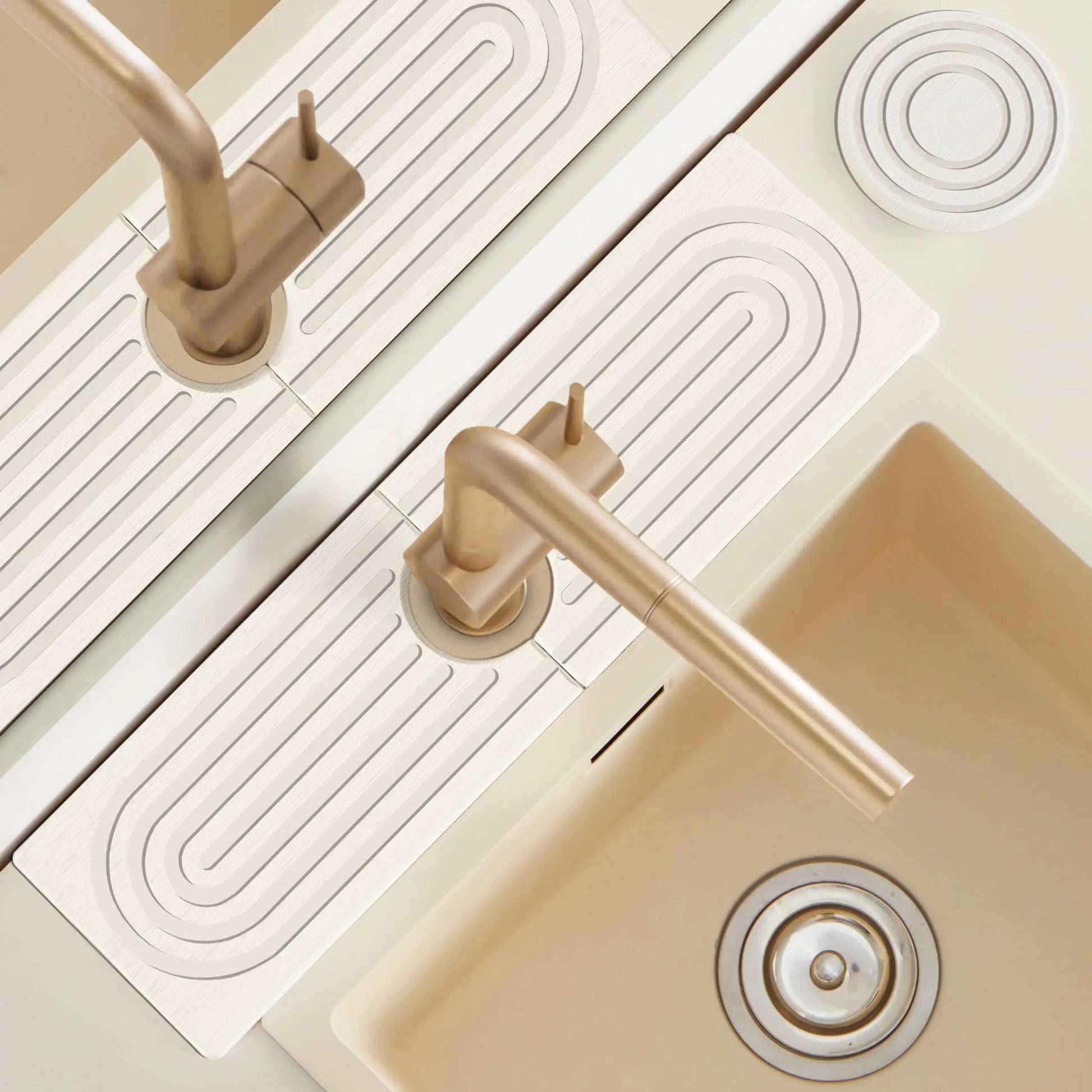 ["【Measure the size】Featuring a two-piece detachable design our faucet mat for kitchen sink is easy to install and disassemble. The overall dimension of the diatomite faucet draining mat (L x W x H) is 18 x 5 x 0.4 with a 2.5 diameter O-hole. At the same time we will give you one 4” diameter round coaster as a small bonus. (NOTE: Please measure your faucet and sink size before purchase to ensure a perfect fit! )" 【Enjoy Drying Quickly】The kitchen faucet mat is made from premium food-grade diatomite a porous durable hygroscopic natural material. The tiny holes in the stone immediately absorb spills and drips around the sink and evaporate within minutes ensuring the countertops stay dry. Compared to sink mats made of silicone or fabric our sink faucet mat splash guard is effective in stopping the acculumation of water ensuring a neat and hygienic kitchen or bathroom. 【Easy to Clean】Minimal maintenance required our diatomite stone sink tray is designed for lasting durability. When your sink faucet absorbent mat becomes stained simply wipe it with a wet towel. For a deeper clean rinse with a brush dipped in washing up liquid and air dry. For stubborn colored stains you can use the included sanding tool to restore the beauty and absorbency of your kitchen sink faucet tray. Regular cleaning is recommended to prolong the life of your sink water splash guard. "【Beautiful&Functional Gift】The modern stylish design of the bathroom sink faucet tray adds a touch of elegance and zen to your home decor.The minimalist striped grooves on the surface prevent items from slipping and the bottom features 8 rubber feet that enhance slip resistance and breathability to prevent water acculumation. The water absorbent splash guard is a nice choice for Mothers Day Thanksgiving Valentines Day birthday housewarming wedding Christmas gifts." 【Countertop Tidy Helper】Our two-piece quick drying stone mat is versatile enough to be used individually or in combination. It can be placed in many places and is compact enough for easy storage without taking up too much space. Not only can it be used as a handle drip catcher in kitchens bathrooms RVs bars and laundry rooms but it can also be used as a drying holder for soaps sponges and cleaning tools or as an organizer for toothbrushes cups hand sanitizers and skin care products. 【One Free Coaster】Our faucet draining mat for kitchen sink has good non-slip and absorbent effect and is suitable for cups of all materials filled with cold or hot drinks or small plants soaps make-up bottles. It absorbs water droplets from cold beverages coffee tea and beer in seconds and protects table tops from scuffs scratches splashes and the dreaded water rings. The diatomite coaster dries itself in seconds and water does not remain inside the coaster so it stays fresh and odorless.]