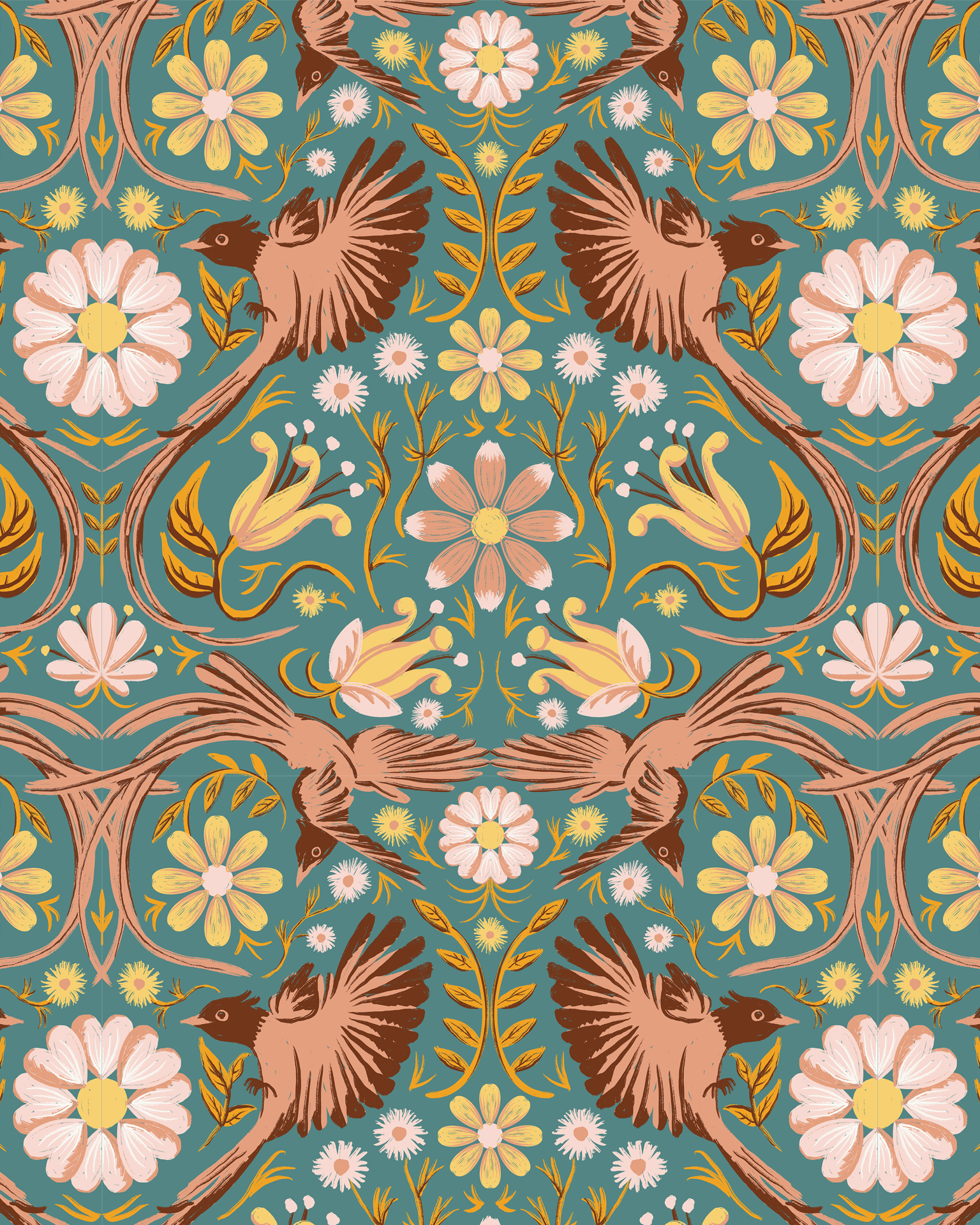 Folkie Birdie Wallpaper, dusty teal, peach & rust