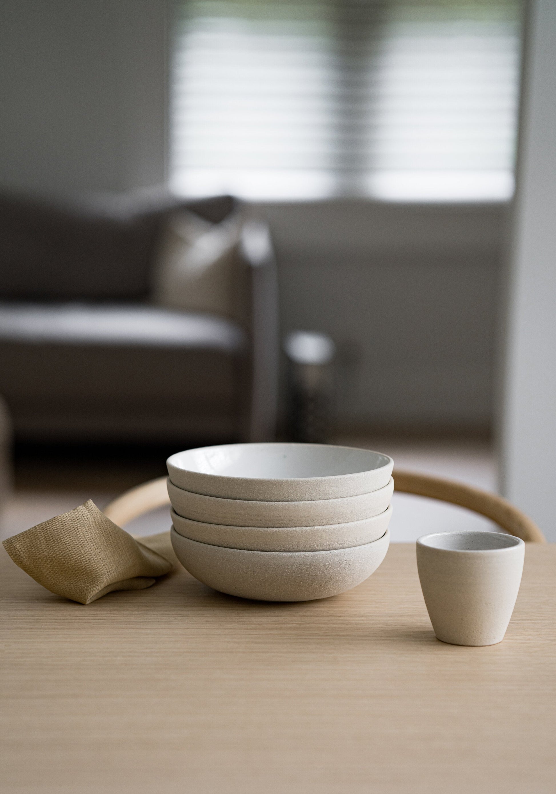 This is the most honest ceramic ware we have ever produced - exposed rough stoneware shows occasional signs of the artisans' fingers that were left during the hand-throwing process. The sides were smoothed but one can still see stoneware pores as if the dinnerware is breathing. The inside is covered in an opaque white glaze for convenient use. These stoneware cups are perfect for your morning coffee as well as while hosting a special party.