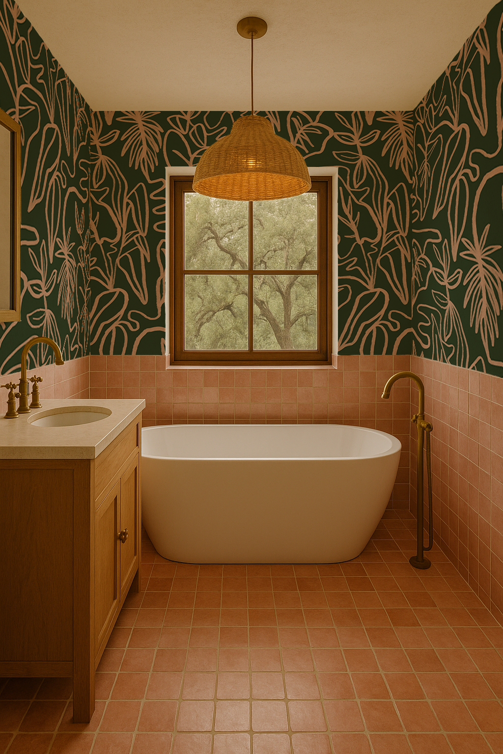 Inked Foliage Wallpaper, green and peach