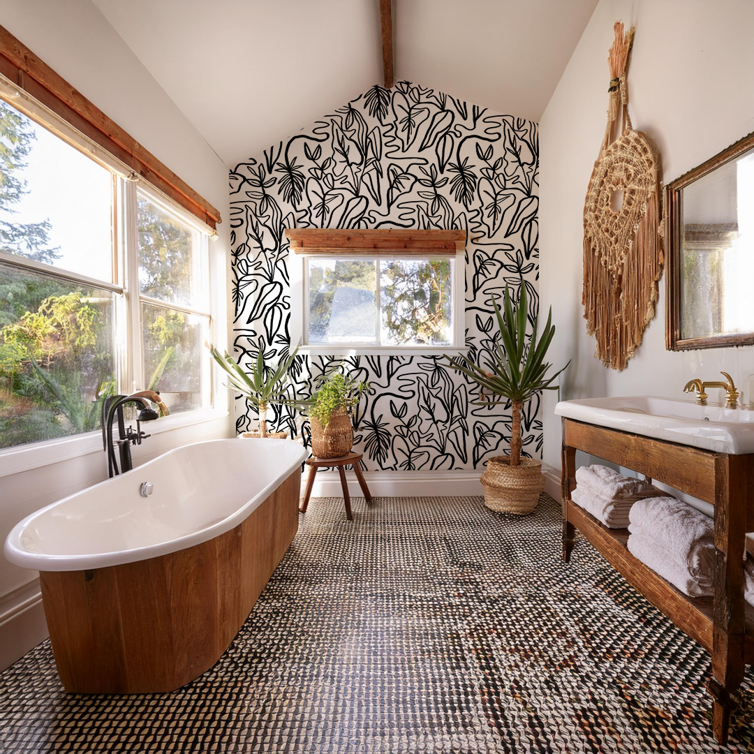 Revamp your living space with Inked Foliage Wallpaper in white and black. This stunning abstract botanical design, by Samantha Santana, adds an artistic touch to any room. With both peel and stick and traditional options, installation is a breeze. And when you're ready for a change, it's easy to remove. Transform your home today!