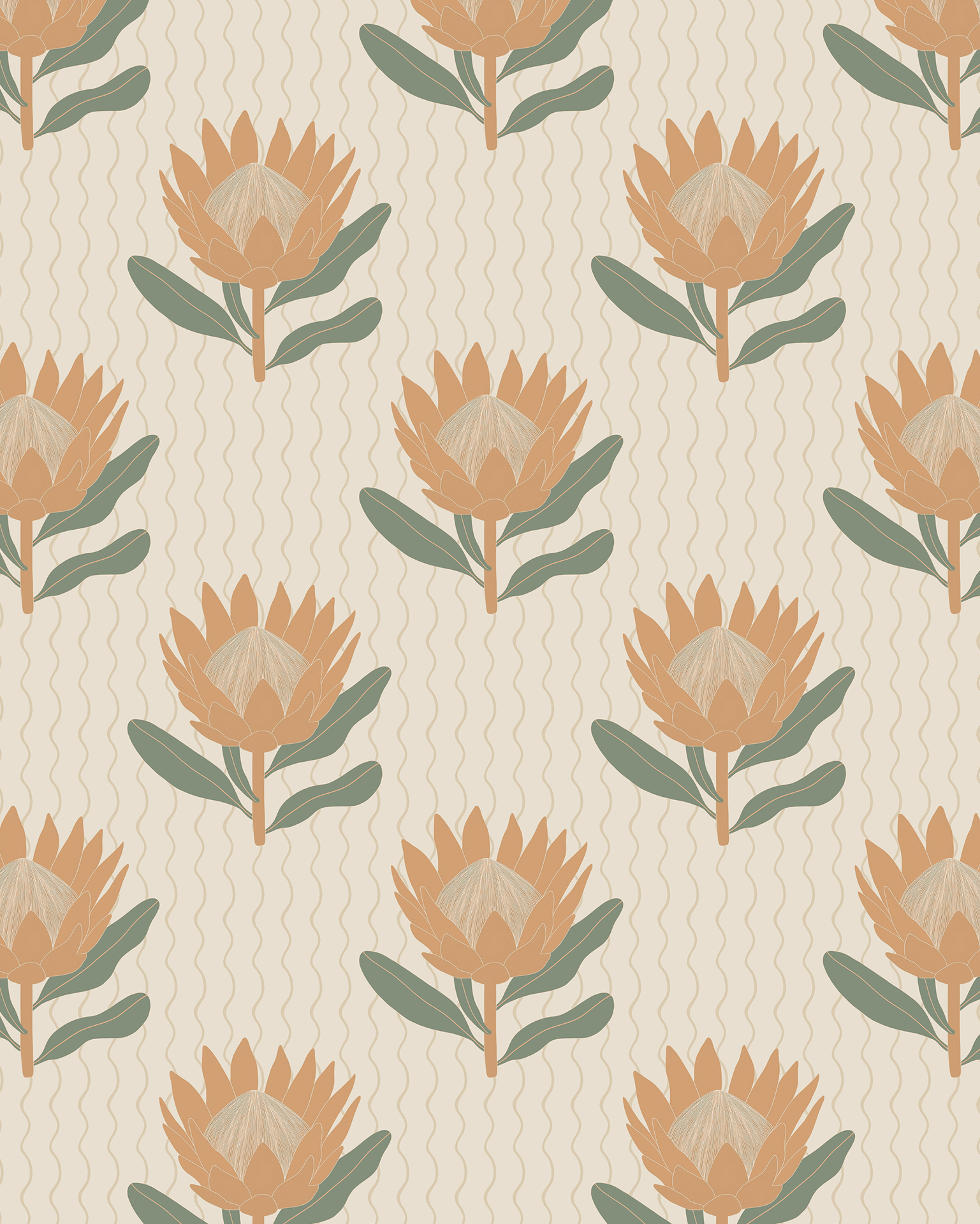 Introducing our King Protea Wallpaper, designed by Samantha Santana. This stunning design showcases the majestic king protea flower in a modern block print style, accented with stylish wavy stripes. Made with high-quality materials, it's easy to install and remove, giving your space a fresh new look. Create a beautiful, artistic atmosphere in your home.