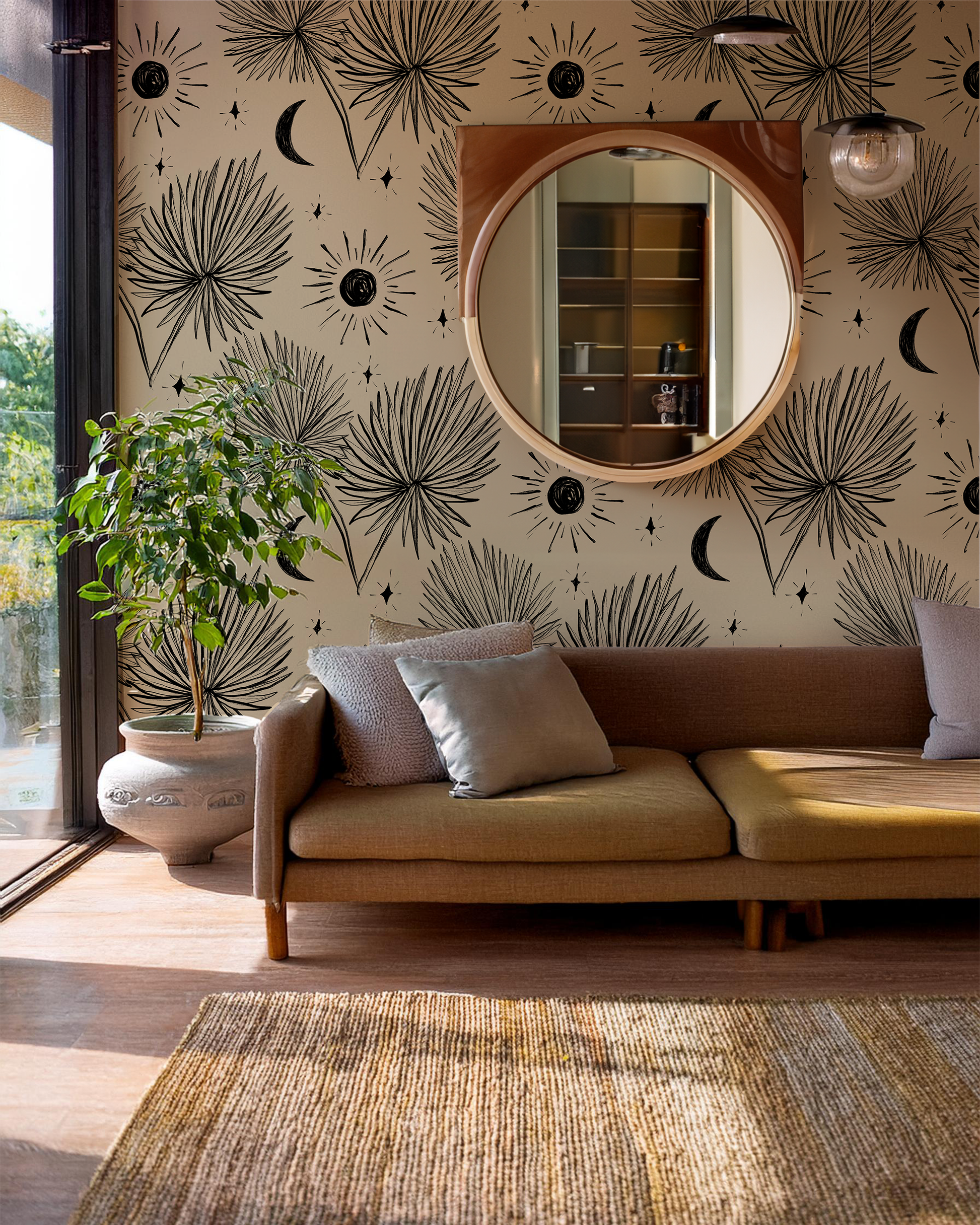 Transform your space into a luxurious oasis with our Night Palm Wallpaper, featuring artwork by Samantha Santana. Inspired by starry summer nights, this wallpaper adds warmth and charm. Choose between easy peel and stick or smooth traditional paste installation. And it's removable - perfect for a sophisticated and ever-changing aesthetic.