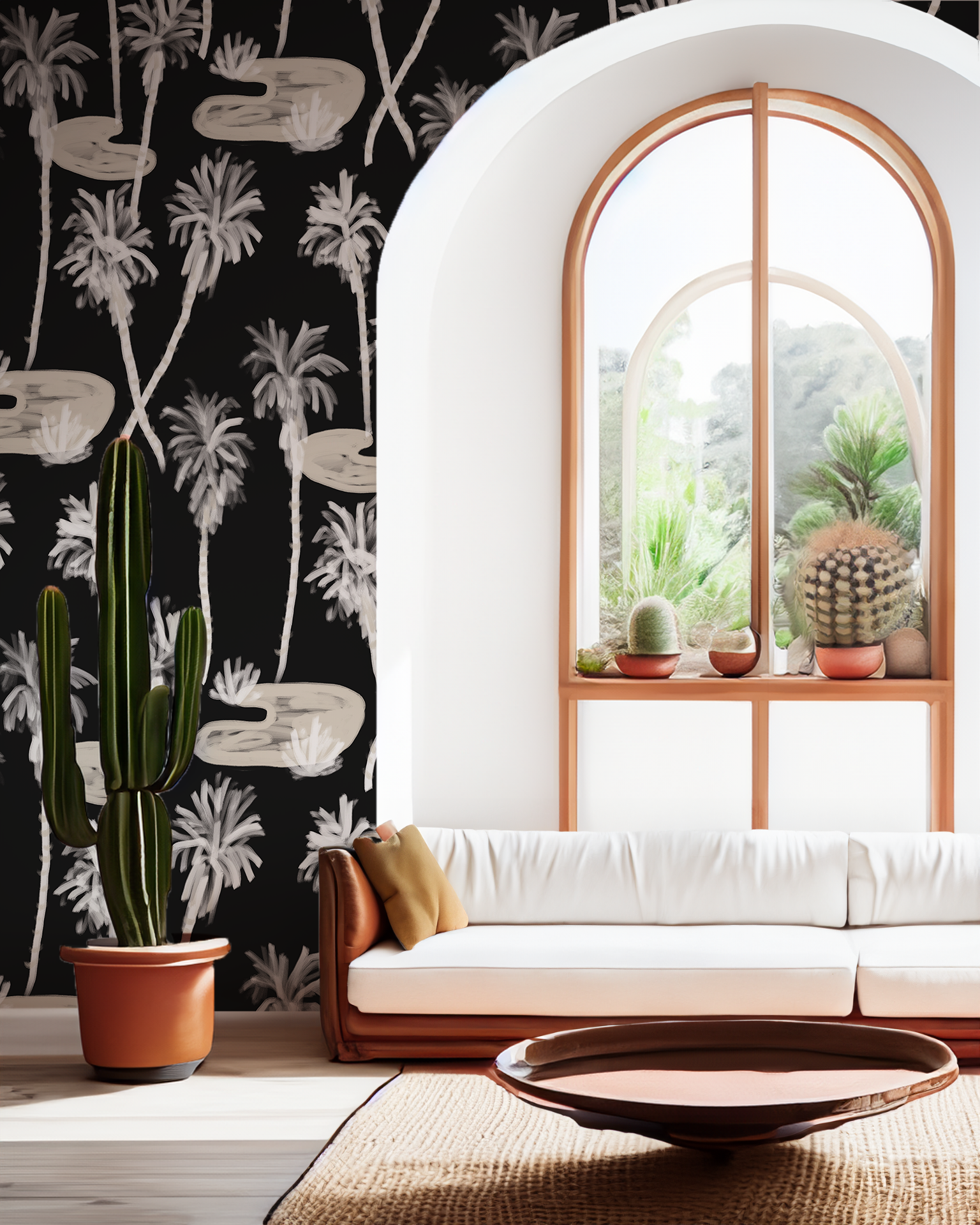 Transform your walls with the Palm Oasis Wallpaper. Illustrated by Samantha Santana, this wallpaper is inspired by the vibrant energy of Palm Springs in a more moody manner. With easy installation options and the ability to remove it, bring a touch of the oasis into your home with this stunning wallpaper.