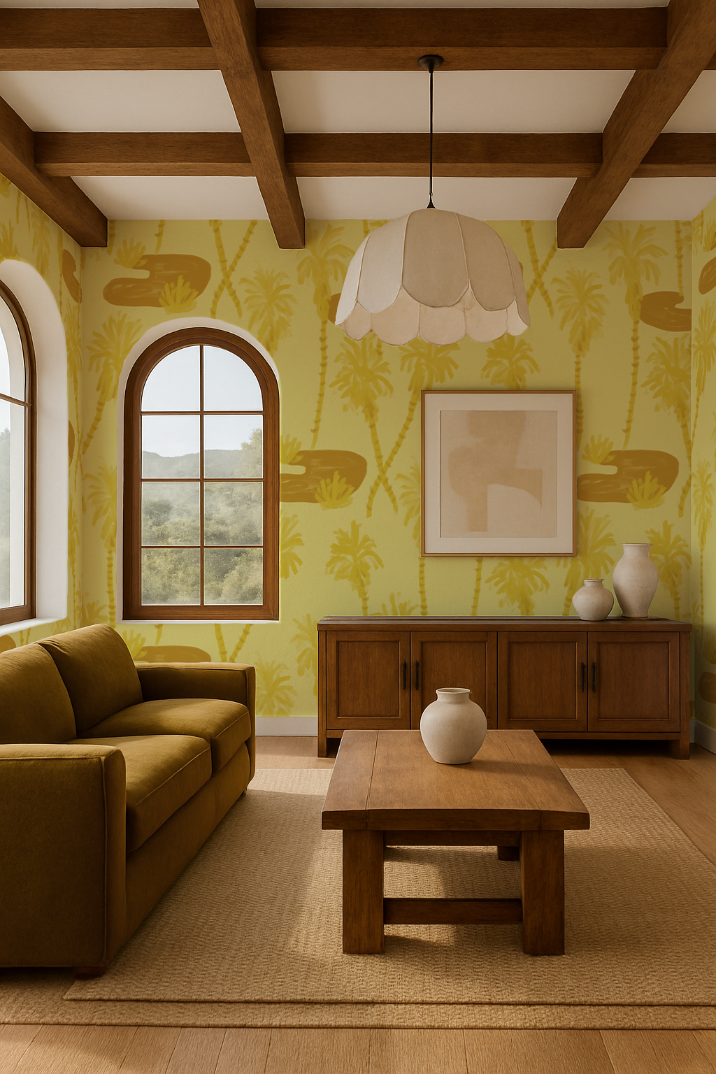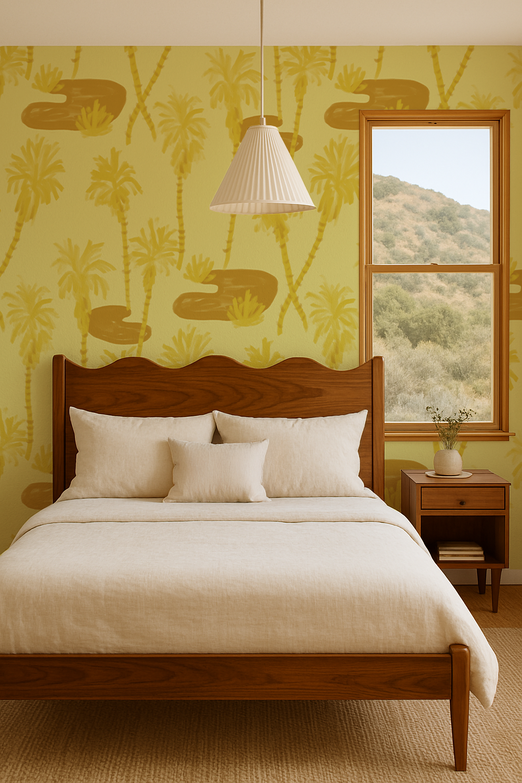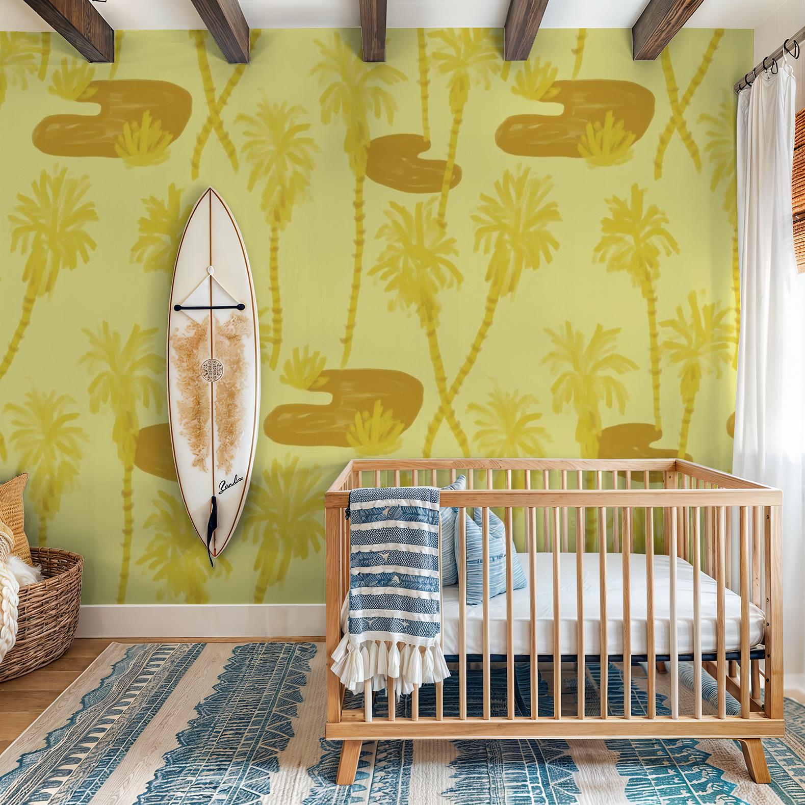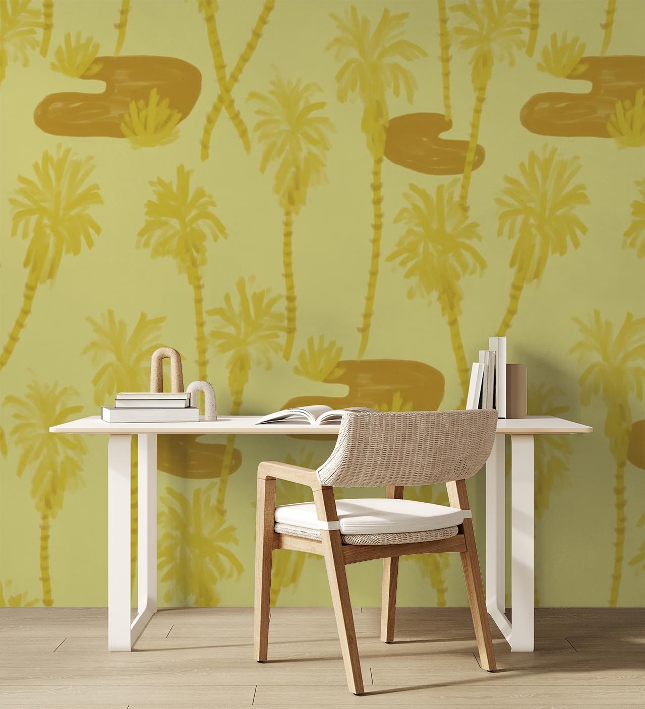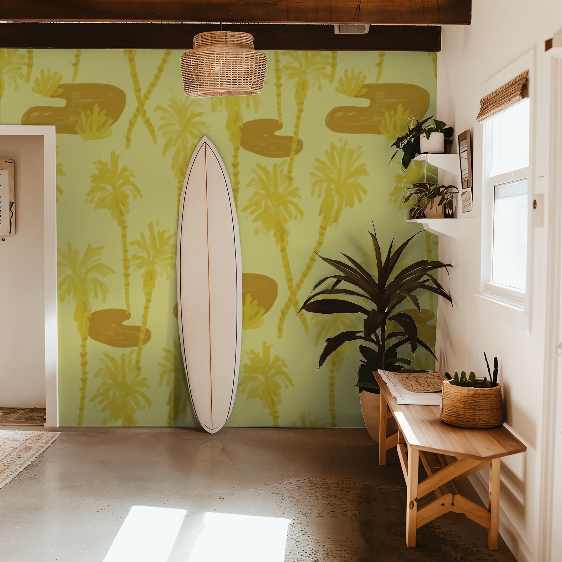 Transform your walls with the Palm Oasis Wallpaper. Illustrated by Samantha Santana, this wallpaper is inspired by the vibrant energy of Palm Springs. With easy installation options and the ability to remove it, bring a touch of the oasis into your home with this stunning wallpaper.