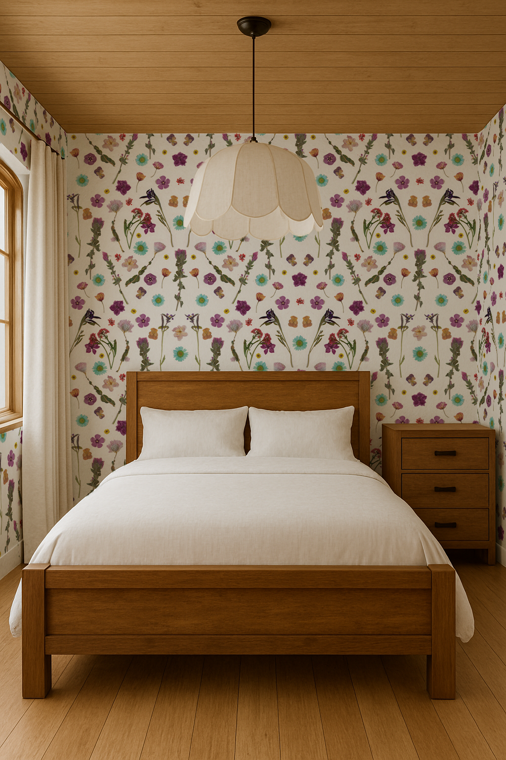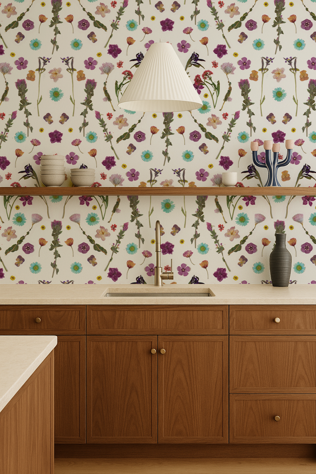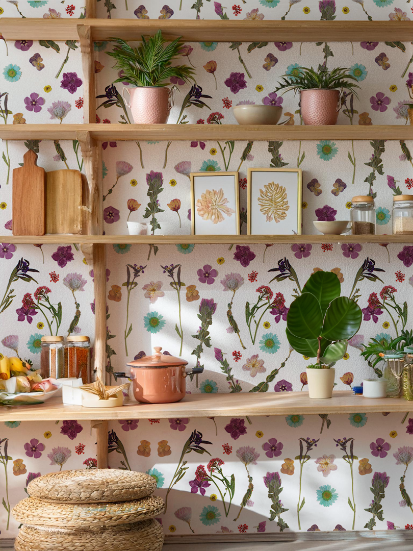 Experience the beauty of nature with Pressed Fresh Version 02 Wallpaper. Crafted from dried flowers arranged by Samantha, this artwork adds a touch of spring to any space. With both peel and stick vinyl and traditional pasted options, installation is a breeze. And when you're ready for a change, it's easily removable. Elevate your walls with this unique and exclusive design.
