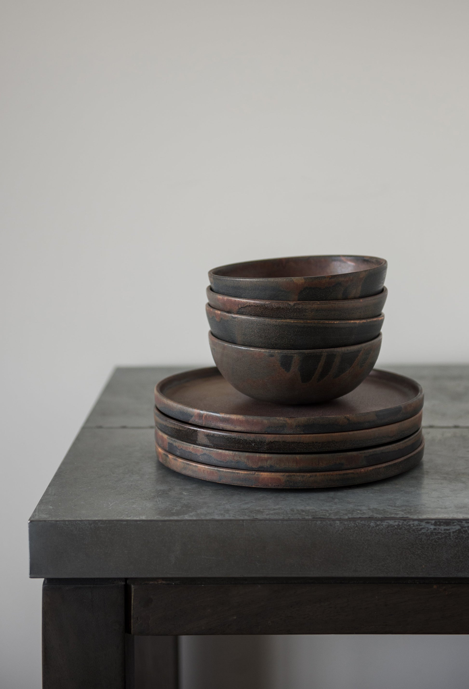Matte brown-black bowl brings pottery vibes to mealtime. Hand-dipped in a reactive glaze that swirls uniquely across each piece. Open form and simple style only add character to this dinnerware.