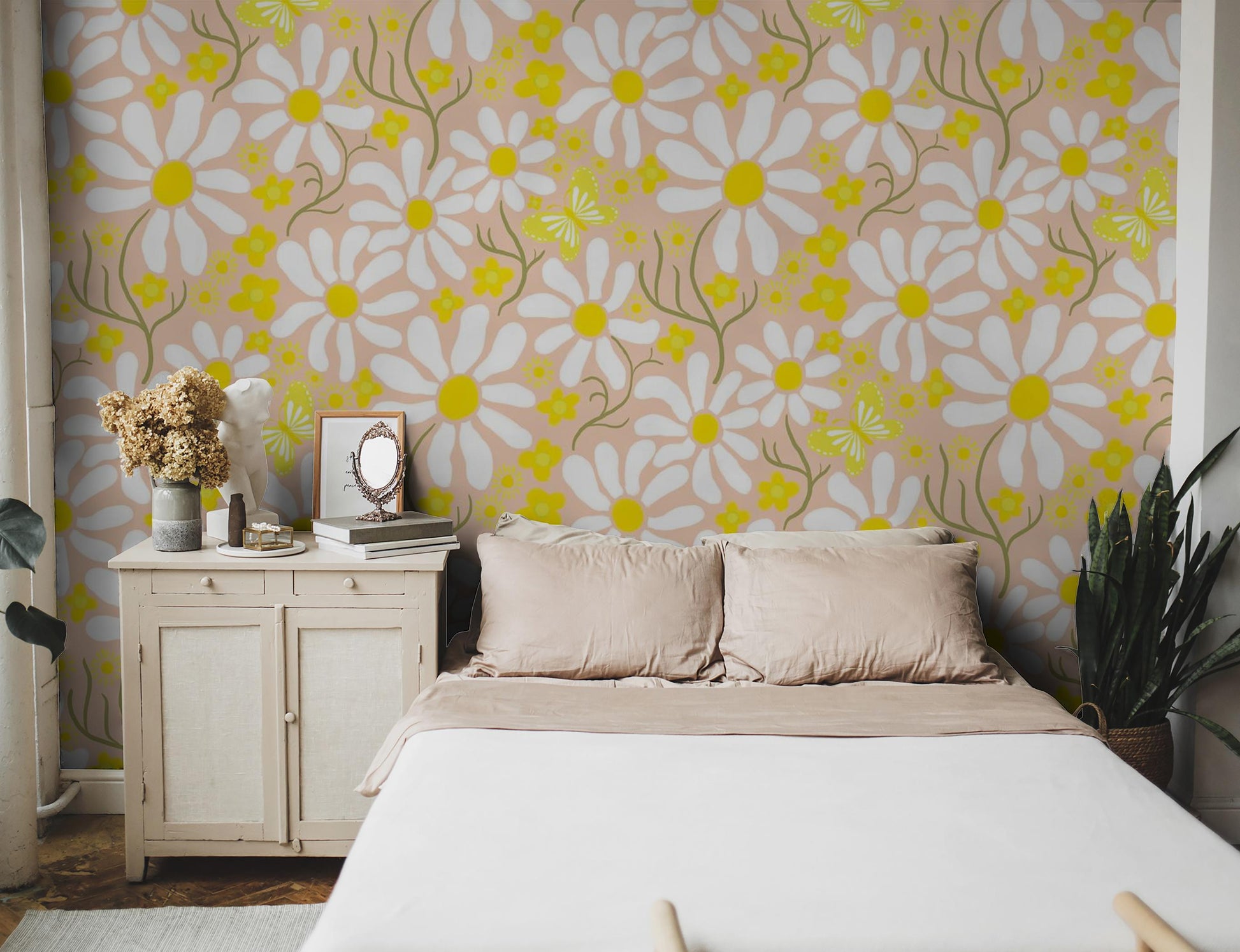 Brighten up your walls with the Spring Daze Wallpaper in beautiful peach & yellow tones. The playful daisies and butterflies illustrated by Samantha Santana add a touch of whimsy to any room. Easy to install with peel and stick or traditional paste options, and even better - it's completely removable!