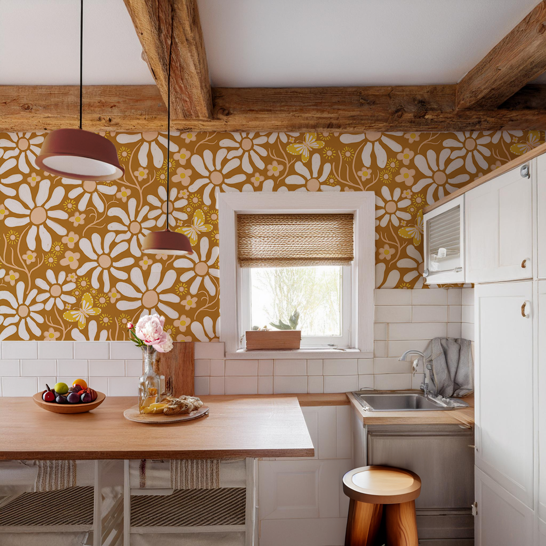 Brighten up your walls with the Spring Daze Wallpaper in beautiful rust tones. The playful daisies and butterflies illustrated by Samantha Santana add a touch of whimsy to any room. Easy to install with peel and stick or traditional paste options, and even better - it's completely removable!
