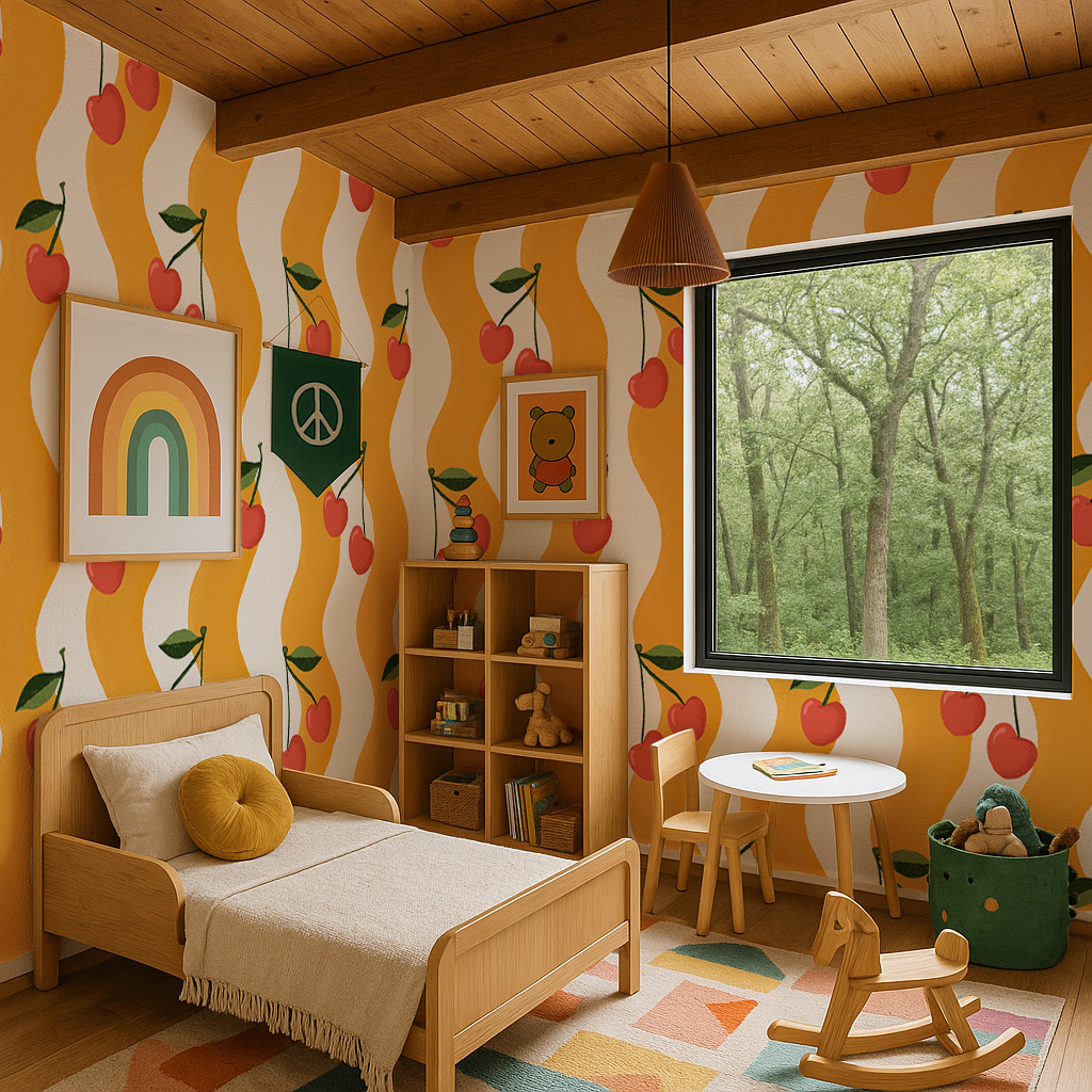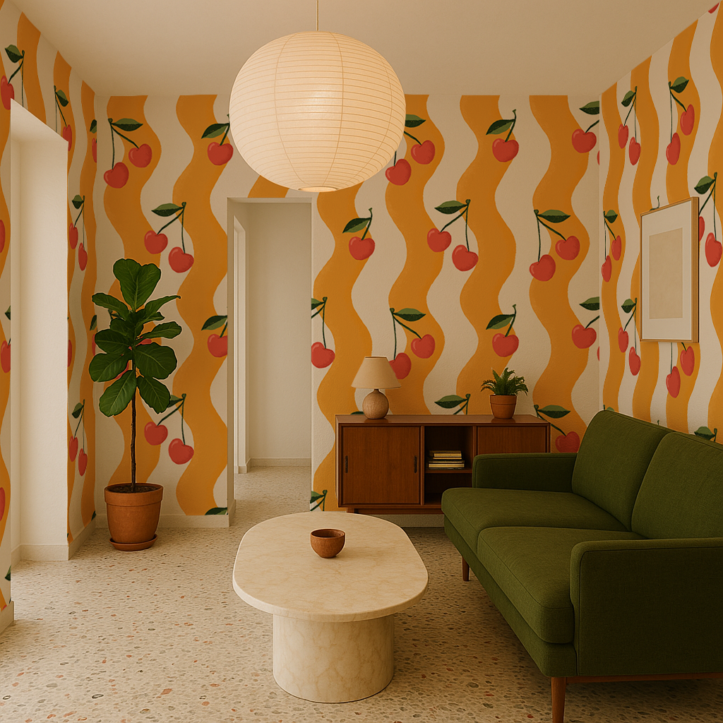 Make your space pop with Wavy Cherry wallpaper - a playful, fruity twist on traditional decor by Samantha Santana. Installation is a breeze with peel and stick or traditional pasted options, and it's even removable!